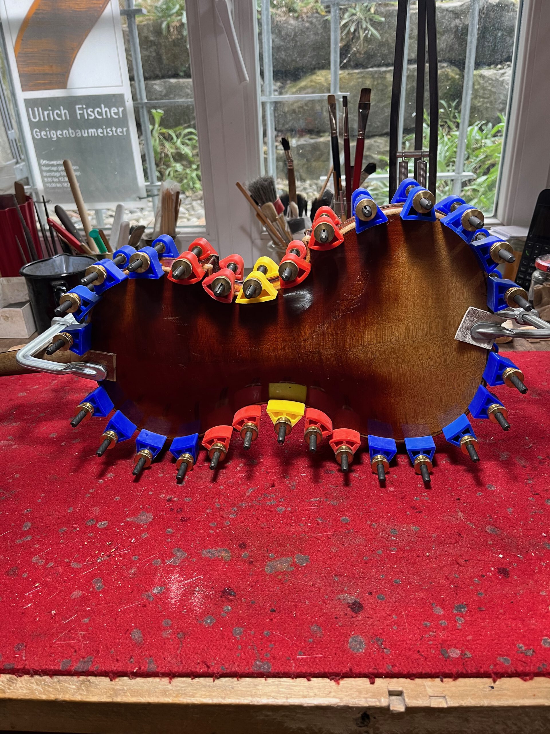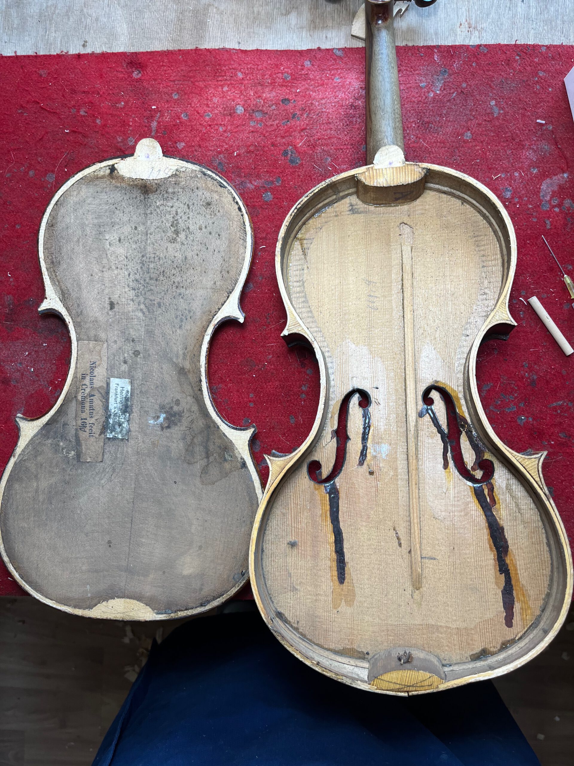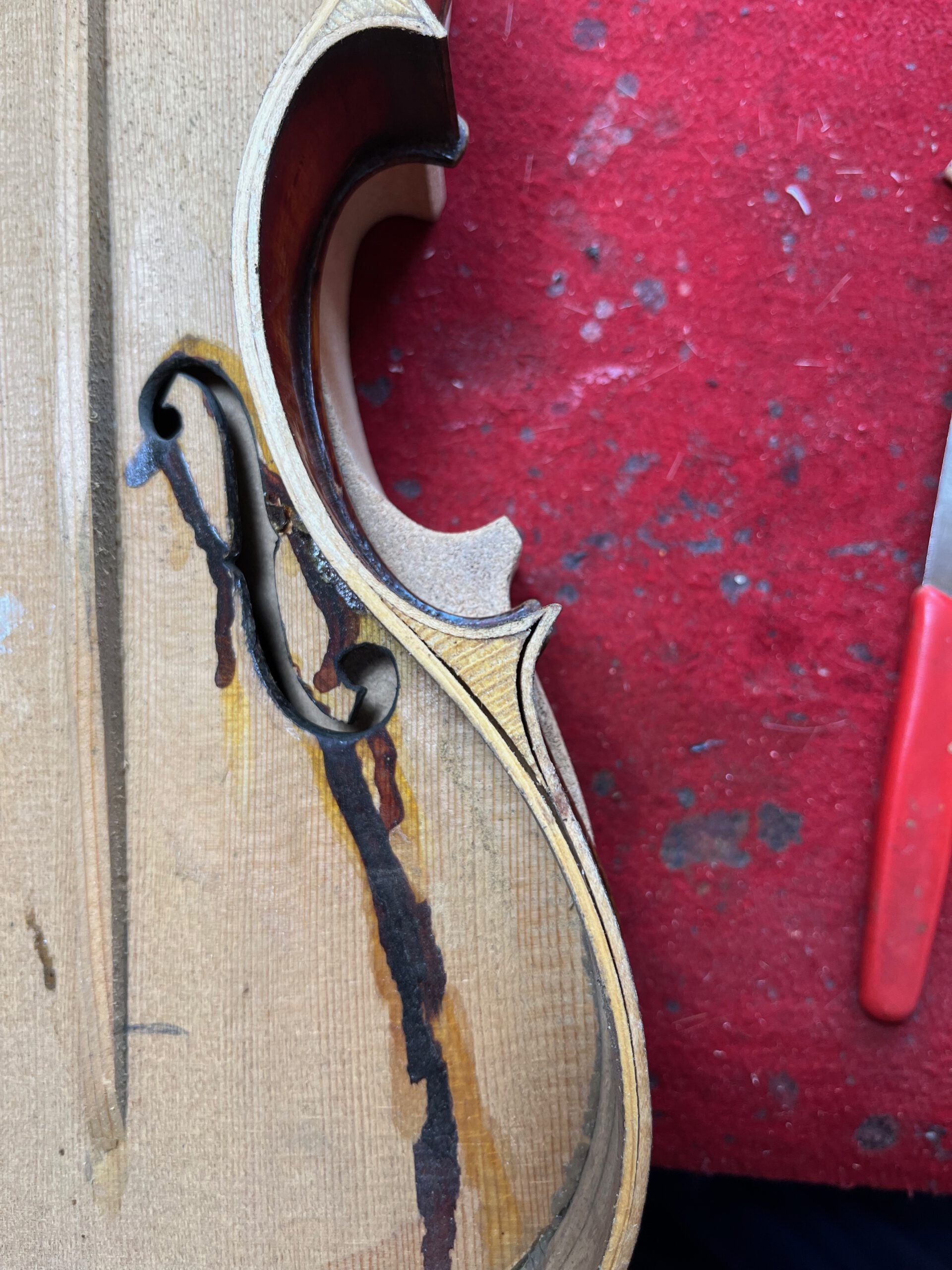 In meiner Werkstatt führe ich Reparaturen aller Art an Streichinstrumenten durch. Hier z. B.  die Wiederherstellung eines gebrochenen Cellohalses durch einen „französischen Anschäfter“.