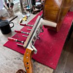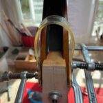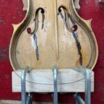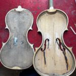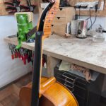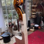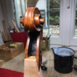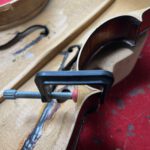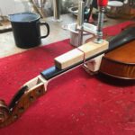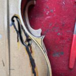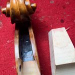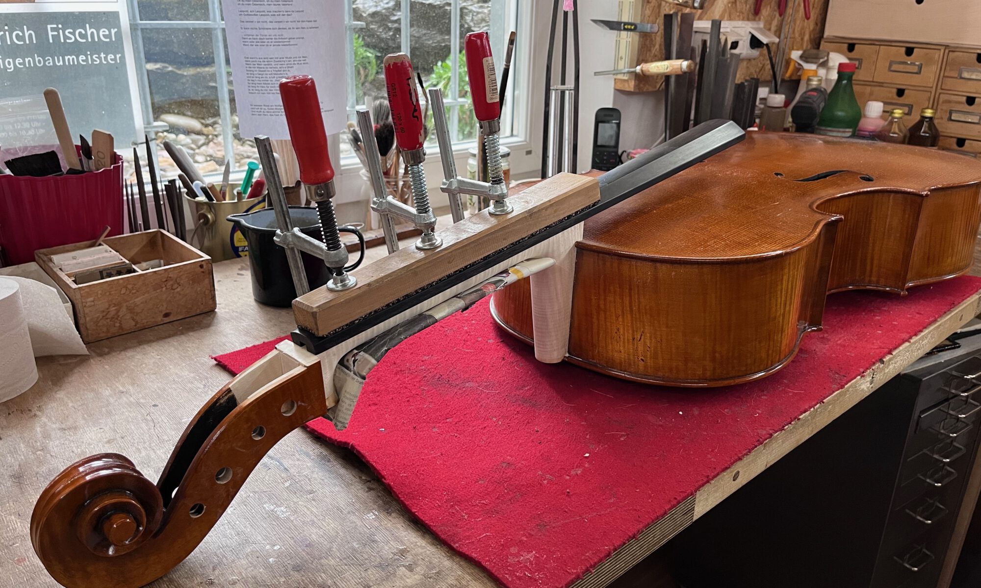 In meiner Werkstatt führe ich Reparaturen aller Art an Streichinstrumenten durch. Hier z. B. die Wiederherstellung eines gebrochenen Cellohalses durch einen „französischen Anschäfter“. Restaurierung einer alten Geige